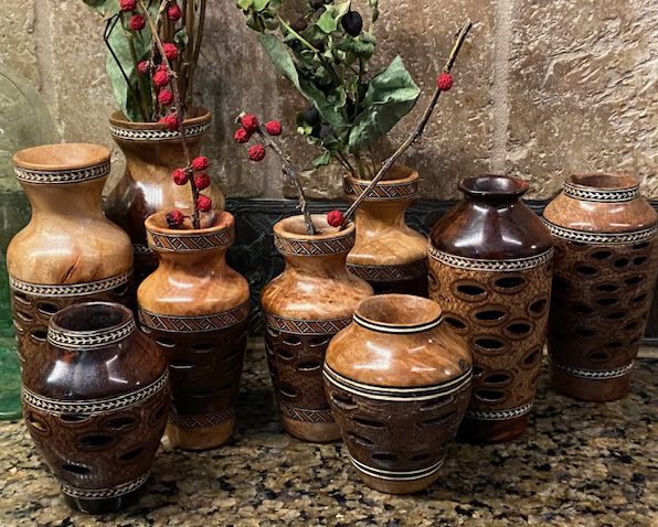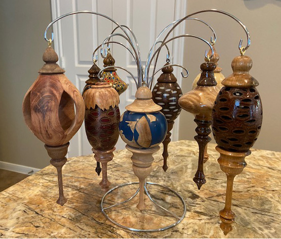 Floating BallSpalted MapleGlobeResin and Eucalyptus BurlOrnamentsSalt and Pepper MillsZebrawoodBanksia BoxCocobola and BanksiaBanksia BoxSmall VasesBanksia and Various WoodVaseBanksia and BurlOrnament Spalted Mable and BlackwoodNatural Edge VaseEucalyptus BurlNatural Edge BowlEucalyptus BurlColored Pencil BoxColored Pencils and ResinColored Pencil BowlColored Pencils and ResinColored Pencil BowlColored Pencils and Resin